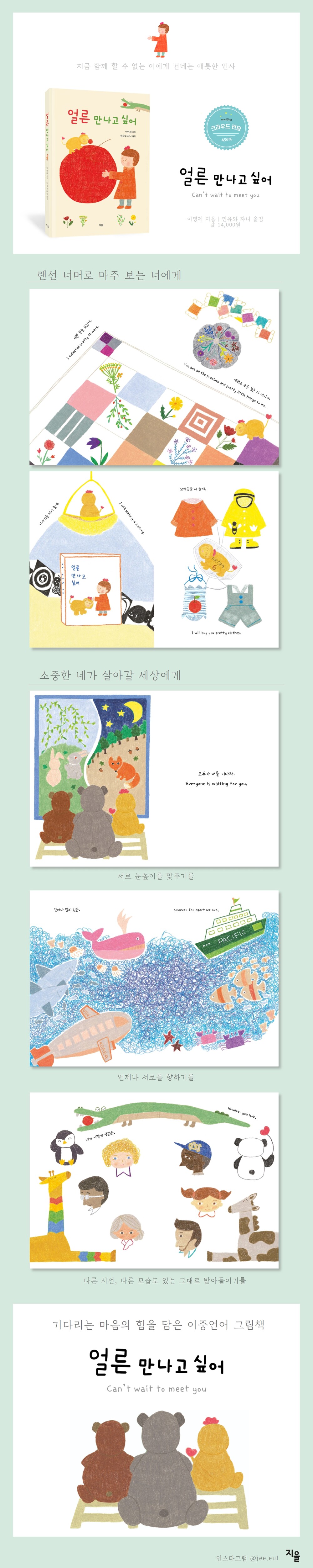 《얼른 만나고 싶어》는 국문과 영문을 함께 표기한 이중언어 그림책입니다. 국경도, 질병도 장벽이 되지 않는, 모두가 스스럼없이 어울리는 세상을 바라며 이 책을 읽는 이들이 언어의 장벽쯤은 가뿐하게 뛰어넘기를 바랐습니다. 그래서 국문은 쉽고 반복되는 입말로 운율을 살리고, 영문은 국문의 의미를 충분히 살리되 네이티브가 쓰는 표현으로 옮겼습니다.